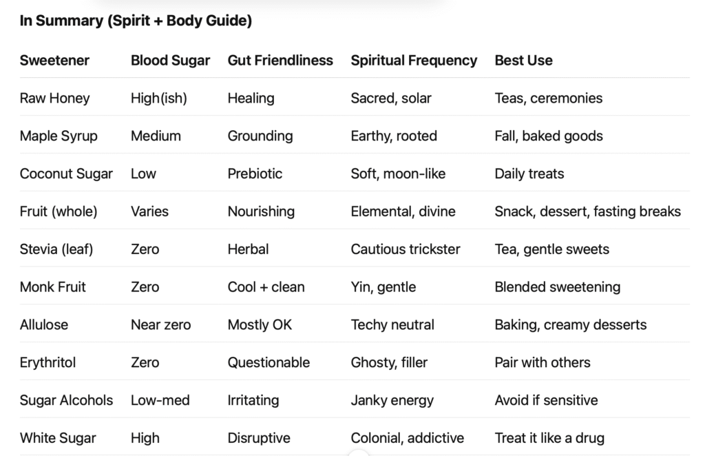 - Spiritual: Heavy in karmic imprint. Colonizer sugar. Often stripped of its original wholeness (esp. white sugar), so it tends to pull energy instead of nourish. But raw forms like turbinado or panela carry more mineral memory and are less “void.”